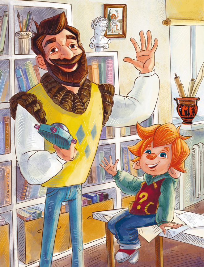 Здравствуйте, ребята! Меня зовут Чевостик. Я живу на книжной полке в библиотеке у дяди Кузи. Не удивляйтесь, я небольшого роста, а нижняя полка в книжном шкафу дяди Кузи очень высокая и просторная, поэтому мне на ней хорошо и удобно. Какой я? Похож на обыкновенного мальчишку, волосы рыжие, характер весёлый. Дядя Кузя в шутку зовёт меня Чевочкой с хвостиком. Но никакого хвоста у меня нет, зато есть ушки на макушке. Больше всего на свете я люблю узнавать новое, поэтому всё время задаю всякие вопросы дяде Кузе. О чём бы я ни спросил, он всё знает и мне рассказывает. Это потому, что дядя Кузя очень умный. Он прочитал много-много разных книг. А ещё мы с ним любим путешествовать! В путешествиях нам помогает времяскок. Это такой прибор, его дядя Кузя изобрёл. Набираешь на времяскоке место и время, куда хочешь попасть, раз, два – и уже там! Сегодня мы тоже наверняка куда-нибудь отправимся!