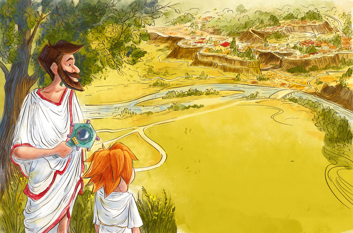 – А я его вижу! Тибр блестит, как серебряная ленточка, между холмами. Только на соседнем холме никакого леса нет! Зато наверху – стена из огромных светлых камней. Дядя Кузя! Это же город!!!