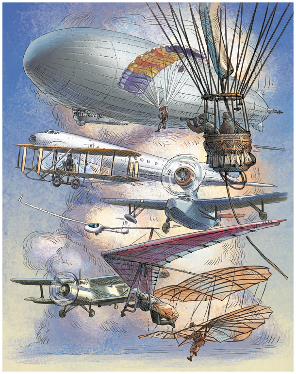 – Да, малыш! Только произошло это не сразу. Много столетий подряд люди пытались научиться летать. Чего они только не выдумали за это время! Один изобретатель даже собирался отправиться в полёт на лодке, которую повезут по воздуху дрессированные голуби или орлы!