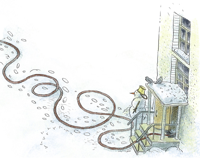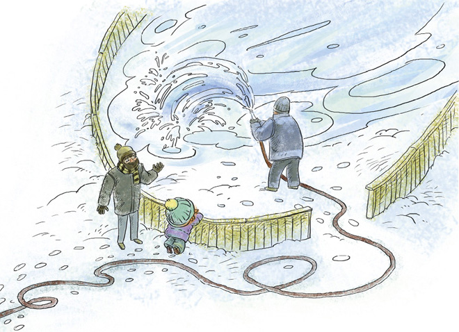 Хорошо на свежем воздухе! Как там каток? Почти готов. Его заливают из длинного шланга. Шланг протянули от дома до площадки во дворе, и теперь её просто поливают.
