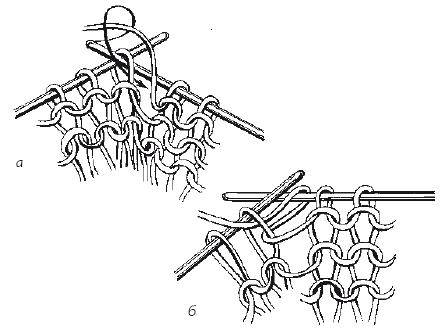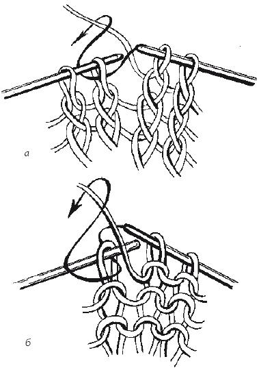 Для того чтобы прибавленные петли не оставляли отверстий в следующем ряду, этот накид следует провязывать лицевой скрещенной или изнаночной скрещенной петлей (рис. 6 а, б).