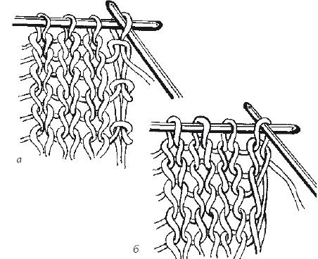Рис. 6 а, б. Лицевая скрещенная и изнаночная скрещенная петли