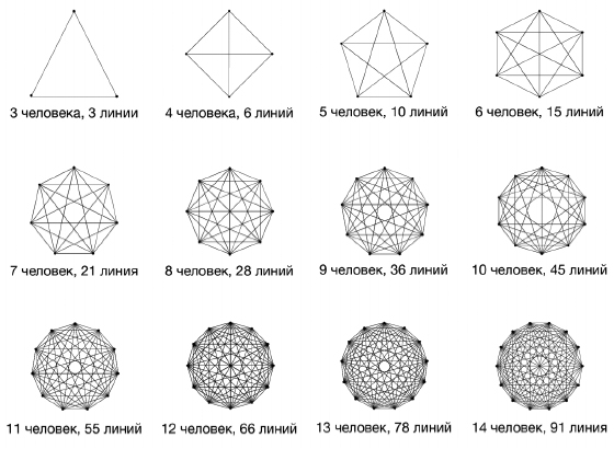 Во-вторых, для меня как для коуча, слова «тридцать человек» означают «сто семь линий коммуникаций», то есть сто семь диалогов – озвученных или неозвученных – между участниками. На рисунке 1 наглядно видно, как в прогрессии увеличивается число контактов между людьми с приходом каждого нового человека в команду.