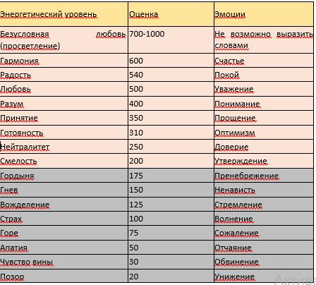 Для того чтобы мы могли оказывать влияние на происходящее в нашем мире, нам необходимо излучать ту же вибрацию, функционировать на той же частоте, которая исходит из окружающей реальности. Дэвид Хокинс, известный исследователь сознания, разработал методику, с помощью которой он измерял состояния эмоций человека при помощи специального прибора, отслеживающего вибрационные частоты Земли. В результате своих исследований он создал так называемую карту сознания, которая делит человеческое сознание на несколько уровней.