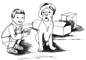 За ларьком, среди коробок от мороженого, кульков от молока и другой вкусной упаковки, сидели два карапуза. Одним из них был Деточка. На голове у него была детская белая панамка, видимо, в спешке нахлобученная первым Карапузом – симпатичным мальчуганом лет четырех. Мальчуган держал в руках сливочный пломбир, и они с Деточкой попеременно его облизывали. Обнимая большую черную собаку в белой панаме, Карапуз приговаривал: «Кушай, кушай, у нас еще есть…»