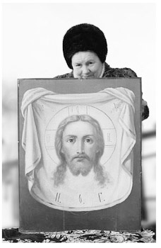 Мама с чудотворным образом Спаса Неруковтворного – фамильной иконой семьи протоиерея Григория Пономарева (1914-1997 гг.).