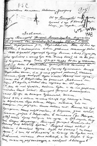 В сентябре 1940 года, как видно из приобщенного к делу постановления прокуратуры Свердловской области, рассматривались жалобы осужденных и их родственников. Однако к делу жалобы не приобщены. Учитывая, что изложенное в указанных жалобах должно быть учтено при пересмотре дела и что жалобы могут оказаться основаниями для принятия по делу решения, просим Ваших указаний о высылке в наше распоряжение последних.