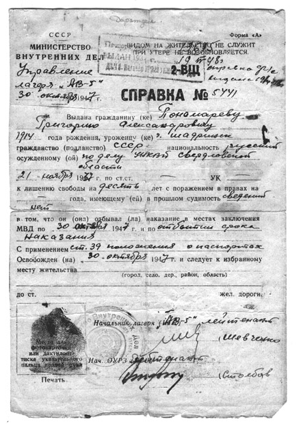 В управление КГБ по Свердловской области поступило заявление гр. Пономарева Г. А., 1914 г. р., ходатайствующего о снятии судимости.