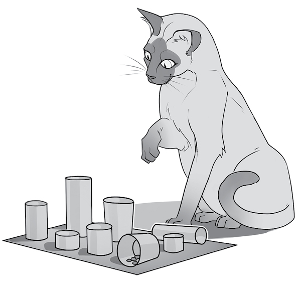 Вам понадобятся тубусы от туалетной бумаги, маленькие стаканчики от йогуртов, крышечки, небольшие емкости и плотный картон или крышка из-под коробки для обуви. Задача самая простая: перевернуть крышку для обуви так, чтобы бортики были направлены вверх, и на дно данной крышки в хаотичном порядке наклеить тубусы от туалетной бумаги, крышечки, баночки и т. д. Т. е. у вас должен получиться своеобразный картонный поднос с емкостями разной высоты. В них вы засыпаете лакомство и показываете котику, где они находятся.