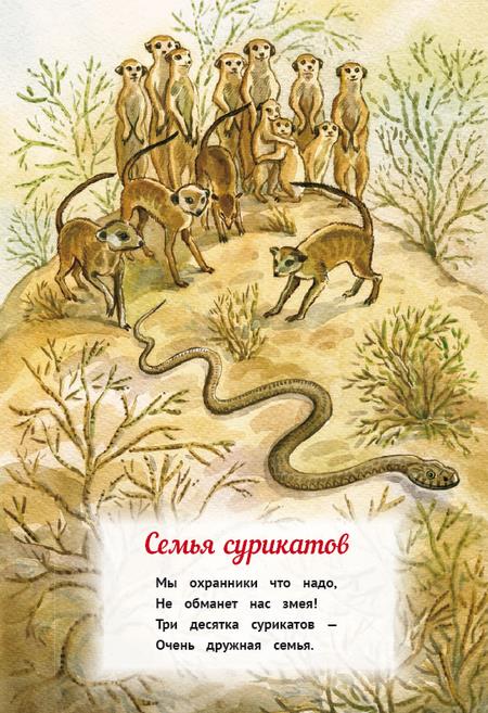 Мы охранники что надо,Не обманет нас змея!Три десятка сурикатов —Очень дружная семья.