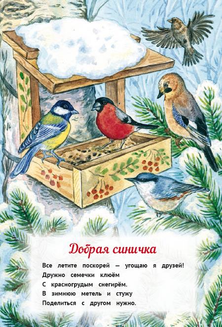 Все летите поскорей – угощаю я друзей!Дружно семечки клюёмС красногрудым снегирём.В зимнюю метель и стужуПоделиться с другом нужно.