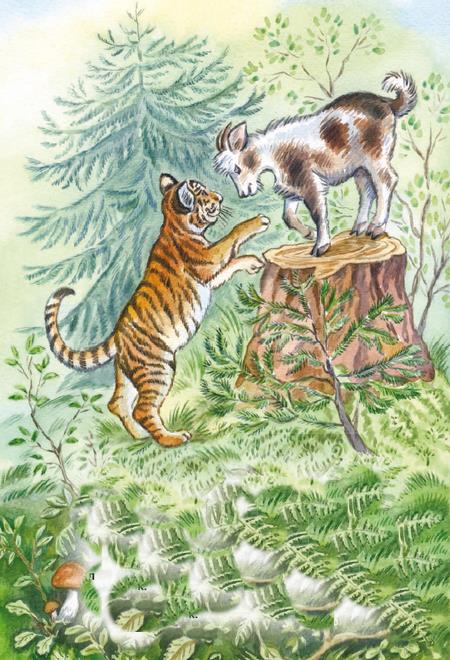 Надёжным другом стать сумелДля козлика тигрёнок:Тот боязлив, а этот – смел,Но в играх добр и кроток.