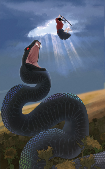 Мико лежала на поле битвы и слышала шум океана. Она лежала среди сотен мертвецов, а дикий ёкай ел её внутренности, хотя она всё ещё продолжала дышать. Она хотела отбиться от него, но не могла пошевелиться, пока его длинные когти перебирали её кишки, надеясь добраться до печени. Другой ёкай отгрызал голову мертвецу, что лежал подле Мико, – это был человек, из груди которого торчало обломанное копьё. Паучьи пальцы ёкая нырнули глубже в живот Мико и царапнули рёбра – он решил полакомиться сердцем, когти пронзили его и потянули наружу.