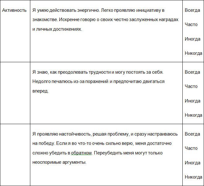 – Решительность. Смело принимаю решения и точно следую выбранному курсу. Не лезу не в свое дело и не отвечаю, когда не спрашивают, но решительно отстаиваю свои границы и принципы.