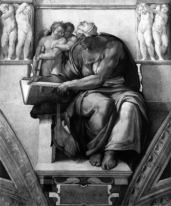 С именем Кумской сивиллы связывается еще и возникновение великого города – итальянского Рима, которому суждено было стать столицей всего западнохристианского мира. Может, поэтому именно Кумскую сивиллу итальянские художники (Андреа дель Кастаньо, Рафаэль, Тициан, братья Карраччи и др.) изображали чаще всего? А дело было так. Спасшийся после падения Трои принц Эней, забрав с собой отца, маленького сына и своих выживших воинов, решил отплыть к далеким берегам Италии. Но во время долгих странствий его обожаемый отец, старик Анхиз, умер. И когда корабли Энея попали, наконец, к итальянским берегам, тот решил отправиться к Кумской сивилле, чтобы узнать о своей судьбе и попросить возможности увидеться с отцом, ушедшим во владения мертвых. Прорицательница согласилась провести Энея в царство мрачного Аида с условием, что герой в точности выполнит наказ отца. Между прочим, этот сюжет послужил основой поэмы «Энеида» римского поэта Вергилия.