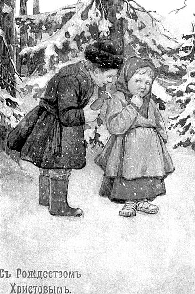 Праздничная деревенская сценка: мальчик дарит девочке конфету. Открытка 1911 года, издана Русским почтовым союзом. Послана с ткацкой фабрики Иваново-Вознесенска в Москву