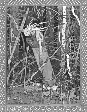 И где же обитает наша Баба-яга? А вы не догадываетесь? Ну тогда еще немного порассуждаем. Среди людей в Яви ей уже нет места – уж больно стара. Но и в Нави, загробном мире, она жить не хочет, ведь она все-таки главная старуха людей. Так что стоит ее избушка на… границе двух миров – обычно-житейского (посюстороннего) и таинственно-непонятного (потустороннего). Повернется избушка в одну строну – из ее двери можно выйти в Явь – мир живых, повернется в другую – откроется путь в Навь – мир мертвых. Недаром же вокруг избушки тын (забор) из черепов. С одной стороны, это символы смерти, а с другой – символ страха живых, помещенный здесь для отпугивания тех, кому еще рано переходить из Яви в Навь.