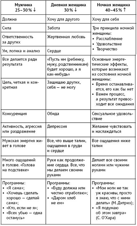 «Женское» состояние тоже неоднородно. На 30 % мы можем выступать в роли дневной женщины (забота, сострадание, желание создавать уют). А 40–45 % должно приходиться на ночную женщину (живость, стремление получать удовольствие, делать то, от чего хорошо именно мне, творчество, сексуальное наслаждение).
