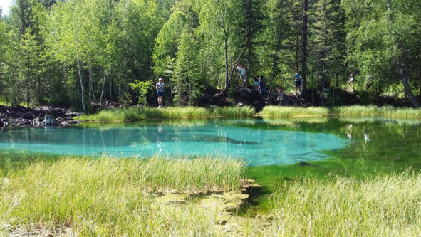 Гейзеровое озеро уникальное по своей природе, образовалось в результате землетрясения и знаменито тем, что постоянно меняет свой рисунок. В озере запрещено купаться, чтобы не нарушить хрупкую экологию этого места. Путь к озеру проходит по деревянному настилу, затем по лесной тропе. Мне это озеро своими очертаниями и рисунком напоминает распил уральского малахита. Неторопливо обхожу озеро вокруг, ищу интересные ракурсы для фотосьемки и делаю фото на память. Вдоволь налюбовавшись, возвращаемся к нашему КАМАЗу.