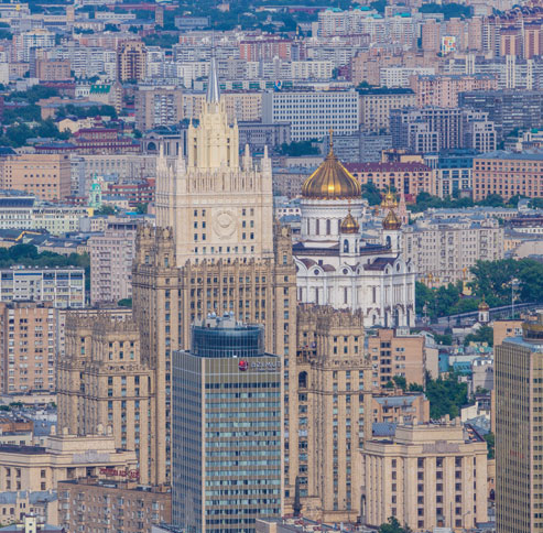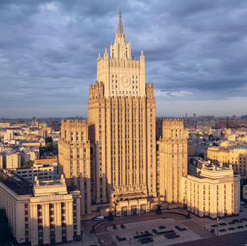 Заключительной точкой нашей прогулки будет высотка МИД, третья на нашем маршруте. Она была построена в 1948 – 1953 годах архитекторами В. Г. Гельфрейхом и М. А. Минкусом. Центральный объем включает 27 этажей, высота здания – 172 м. Характерная особенность – смонтированный из железобетона огромный герб СССР на фасаде. Он расположен на высоте 114 м и занимает площадь в 144 кв. м.