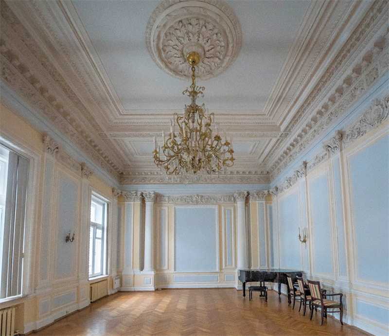 Зал предназначался для приемов и балов, здесь звучала прекрасная музыка, а на потолке мы видим лепнину в виде лиры. В советское время зал также использовался для приемов и званых ужинов. На рояле фирмы Бехштейн играл Сергей Прокофьев, частый гость посла Норвегии. В Большом зале также сохранился уникальный наборный паркет времен Грачева.