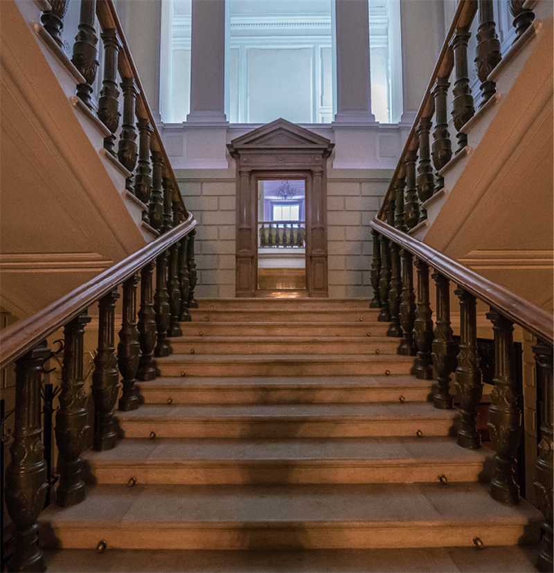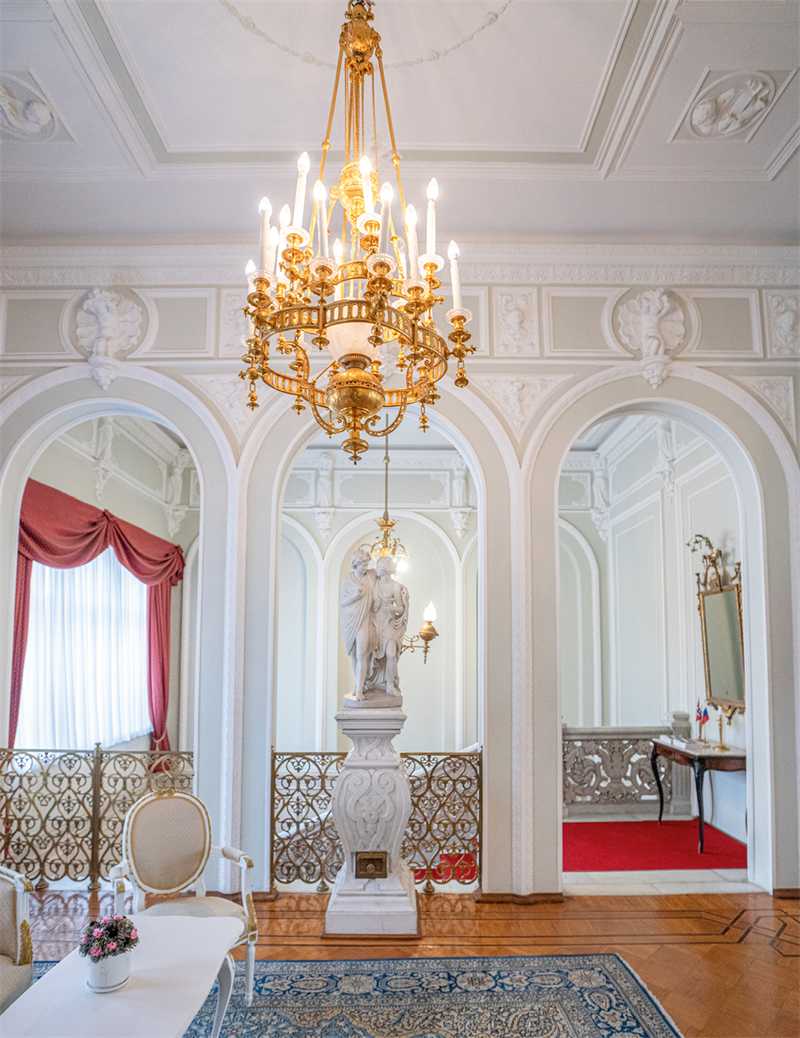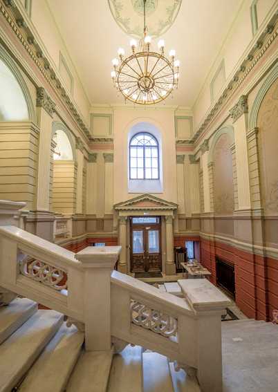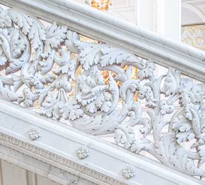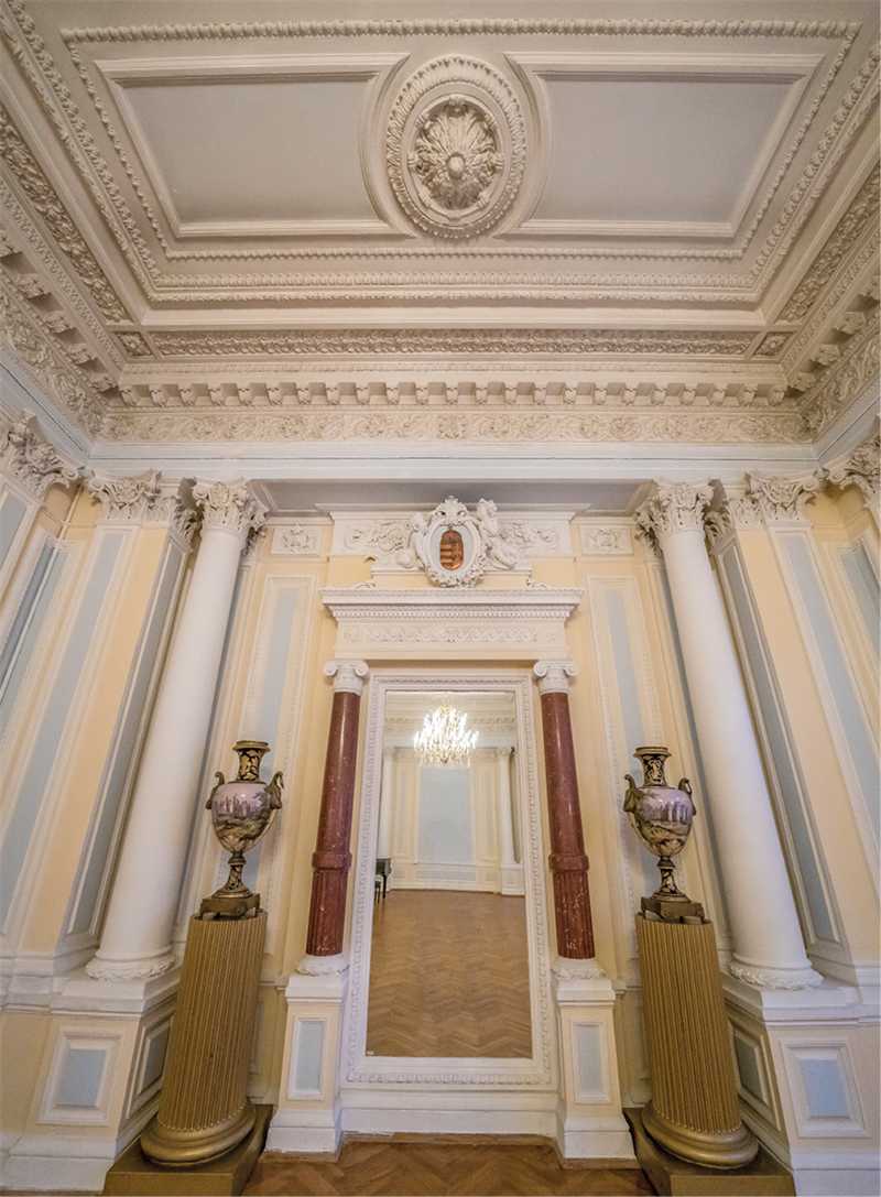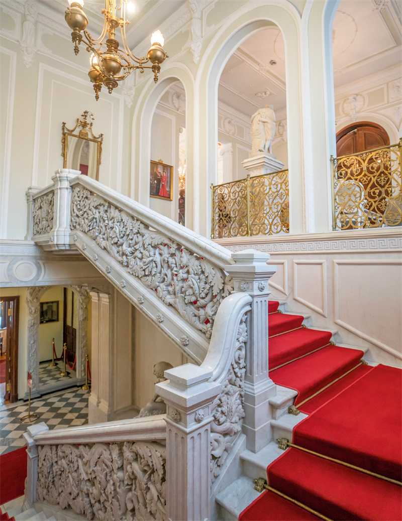По центру здания возвышается восьмигранный купол, покрытый шпиатром, в аттике расположен картуш с вензелем владельца – «МГ». Весь протяженный фасад украшен изящными лепными украшениями. Заглянем внутрь этого роскошного особняка. В вестибюле нас встречает мраморный пол в «шашечку» и бесподобная мраморная резная лестница с листьями аканта – настоящее произведение искусства. Рядом с лестницей мы видим зеркало в резной мраморной раме и скульптуру «Амур со львом» итальянской работы середины XIX века.
