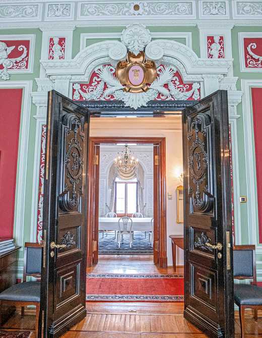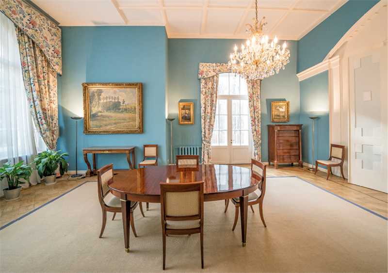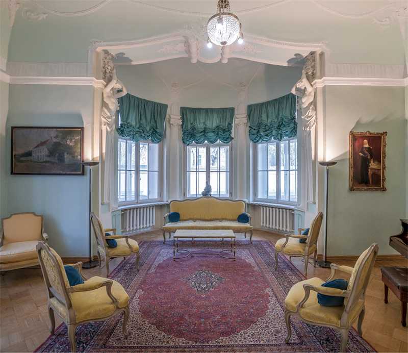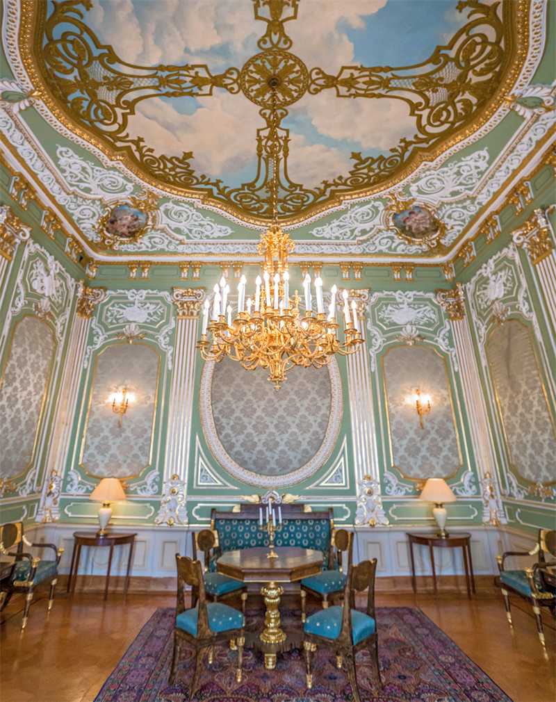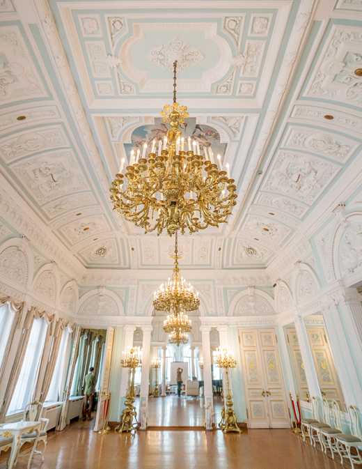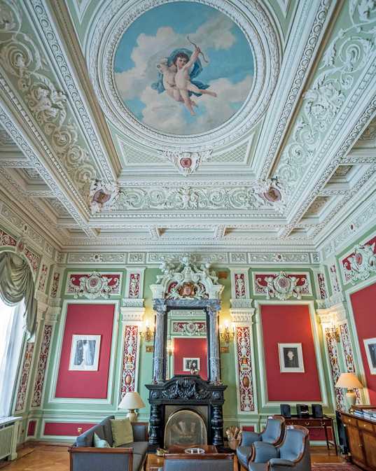 За Большим залом следуют две гостиные – Зеленая и Красная, также с живописными плафонами. В зеленом зале в стиле барокко на потолке – живопись, выполненная Ягужинским. В медальонах по углам изображены аллегории – «Четыре времени года». Там же находится еще одна монограмма Грачева – латинская буква «G».