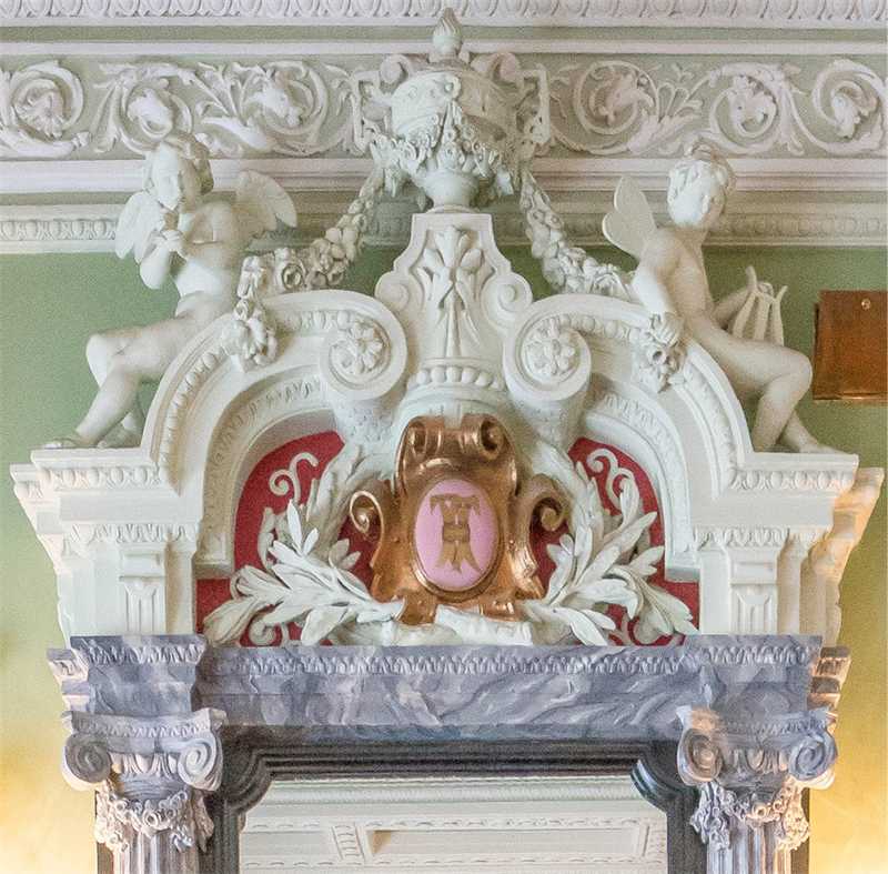 Пройдем в следующую гостиную, Красную. Живописный плафон в этой комнате выполнен Ягужинским и Брызгаловым. Резной мраморный камин – это главное украшение красной гостиной! Над камином в картуше, над дверью, на потолке, на стенах также помещена монограмма Грачевых – две сплетенные буквы «Г».