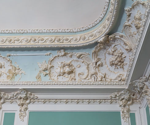 Деревянная резьба фабрики Шмита отличалась тончайшей проработкой каждой детали. По эскизам Бойцова выполнили все столярные работы: необыкновенные потолки, паркеты, панели на стенах, мебель и, конечно, парадную дубовую лестницу, где на деревянных колоннах сохранились резные лики – бородатого мужчины и девушки. Рассказывают, что это изображения последних владельцев особняка, Олсуфьевых, но красивая история не верна. Специалисты утверждают, что это образы древесных божеств, дриад, и они были изначально вырезаны на колоннах.