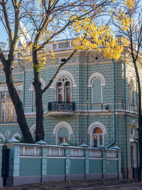 Следующий особняк на маршруте переносит нас на сто лет вперед. Он был возведен в 1889 году по заказу князя Святополк-Четвертинского по проекту московского архитектора Петра Бойцова. На предыдущем маршруте мы любовались домом Берга его работы. В 1887 году князь выкупил у барона Боде-Колычева узкий участок земли и занялся строительством.