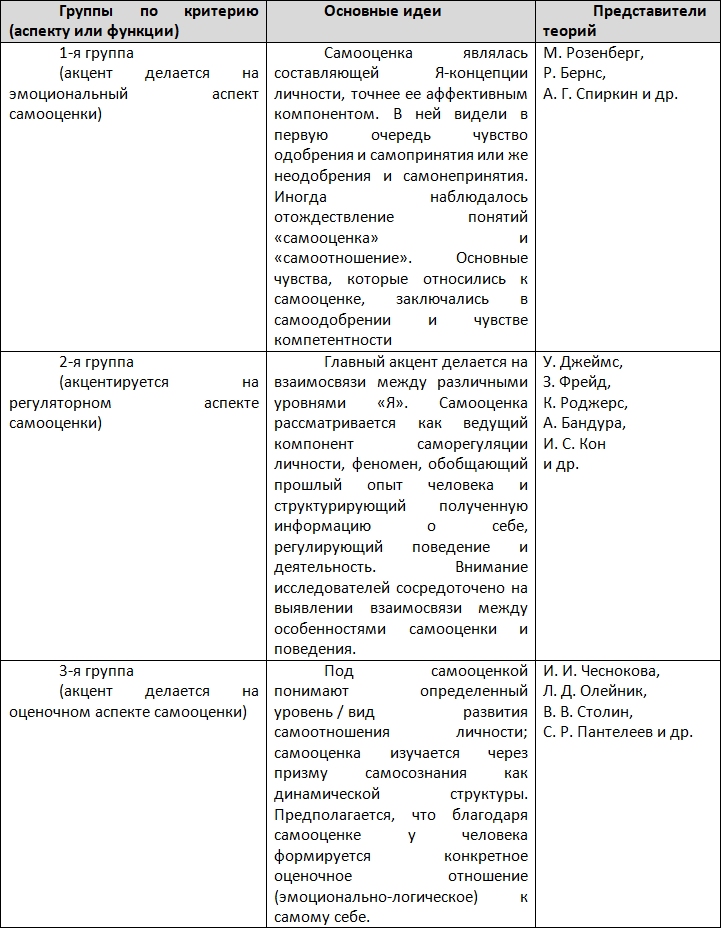 В принципе, все теоретические подходы к изучению самооценки можно объединить в три основные группы (см. таблицу 1).