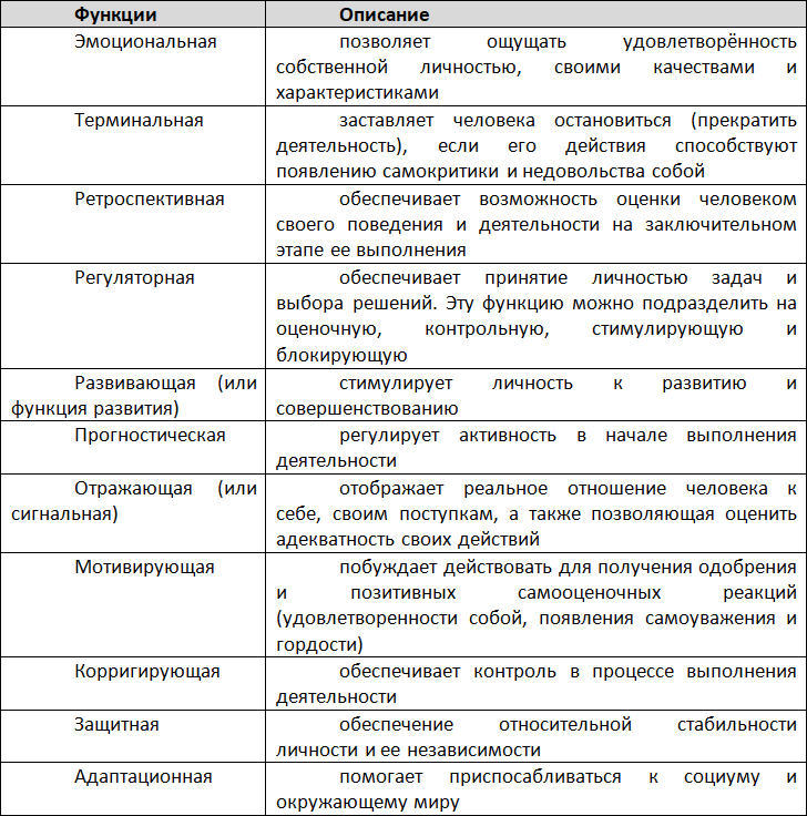 От самооценки зависит многое: взаимоотношения с окружающими, способность человека к критическому мышлению, его требовательность к себе. Она оказывает влияние на эффективность деятельности, развитие личности и многое другое [21]. Кроме того, самооценка – центральное звено произвольной саморегуляции, определяющее уровень и направление активности человека, его отношение к окружающим и самому себе.