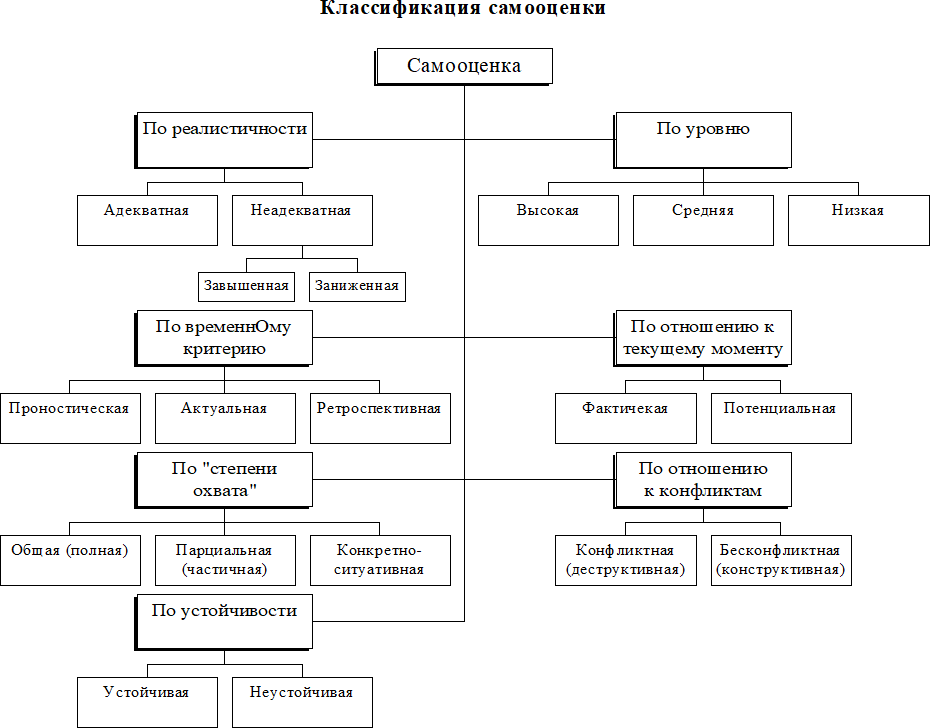 Для того чтобы сделать понятие самооценки более чётким и структурированным, рассмотрим её классификацию по нескольким критериям: