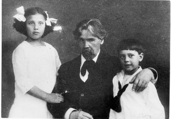 Вот в нем мы и жили. А в большом доме жили Самарины: Лиза, Юша и Сереженька. Были они после смерти Веры Саввишны на попечении ее сестры Александры Саввишны Мамонтовой. Лиза была чудесная девочка, удивительно умная и хорошая. Сереженьке было пять лет. Он был веселый. Все лето мы проводили вместе. В сентябре я и Сережа заболели скарлатиной. Я болела во флигеле, а Сереженька в Москве. Мишу мама увезла в Москву, а я с папой осталась в Абрамцеве. И вот я помню очень отчетливо вечера в Абрамцеве с керосиновой лампой, рядом с папой. Уже была поздняя осень, когда я начала вставать и ходить по комнате. Помню, мама с Мишей уезжали из Абрамцева в Москву. Я смотрела на нее в длинное узкое окошко. Миша стоял под окном в желтом драповом пальтишке с золотыми пуговицами, в шапочке и желтых кожаных гетрах. Рядом стояла мама, оба мне кивали и улыбались. В дом им войти было нельзя, карантин. И вот все шесть недель моей болезни папа возился со мной, как нянька. Читал мне, кормил меня, лечил. Я помню папино лицо, склонившееся надо мной. Русая бородка, усы, серые глаза выразительные, лицо бледное (у папы никогда не было румянца), волосы копной, чудная улыбка была у папы – лучистая. Вскоре я поправилась, и папа отвез меня в Москву на поезде. А Сереженька умер, и его схоронили в Абрамцеве, рядом с матерью Верой Саввишной, той самой “девочкой с персиками”, которую писал Серов».