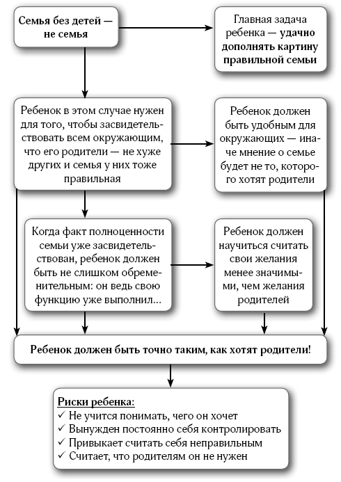 Так что, по нашим наблюдениям, рождение ребенка ради продолжения рода приводит точно к тем же последствиям, что и его рождение для удостоверения полноценности семьи: ребенок в этом случае должен быть в точности таким, как хотят родители – максимально похожим на них. А иначе как окружающие-то поймут, чей род продолжается?!