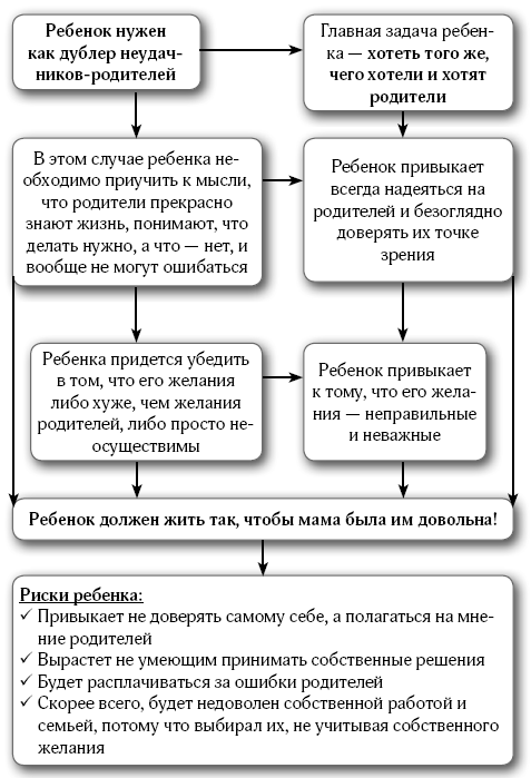 Частным случаем этого варианта (к счастью, довольно редким) можно считать ситуацию, когда ребенок рождается, чтобы унаследовать родительское дело или продолжить династию. Эта идея тоже вырастает на почве безграничной уверенности родителей в непогрешимости их представлений о жизни, успехе, счастье и всем прочем в том же духе. Ребенку при этом, естественно, категорически не рекомендуется иметь свое собственное мнение – кроме тех случаев, когда оно совпадает с родительским…