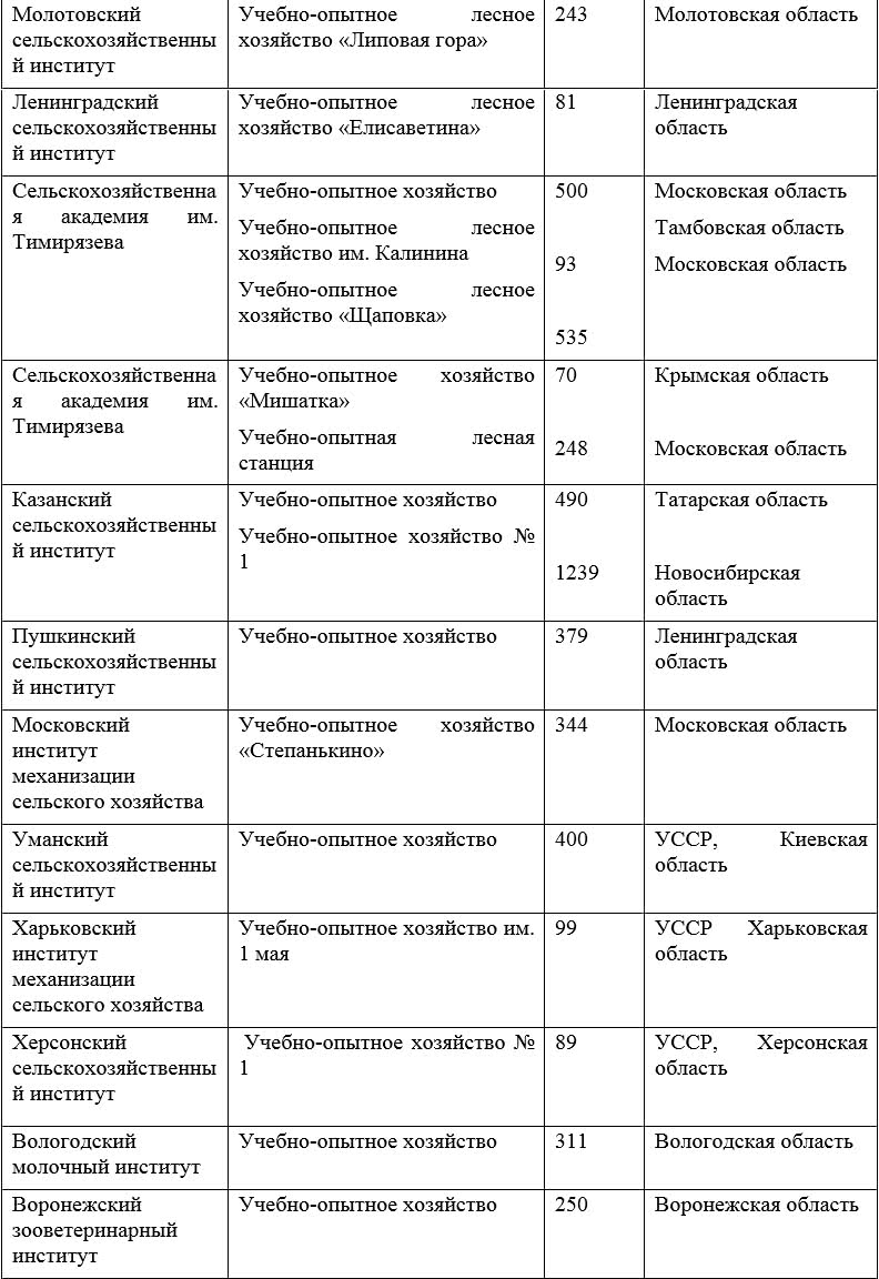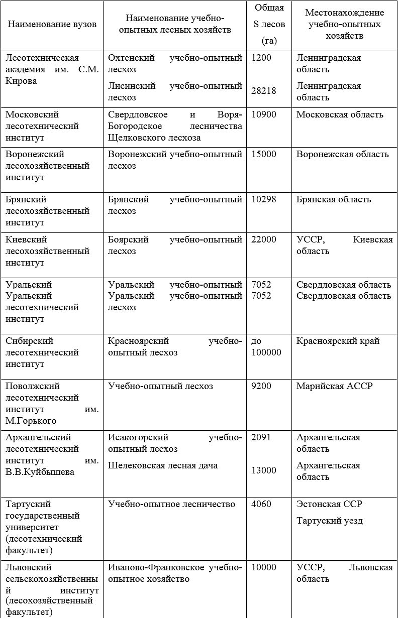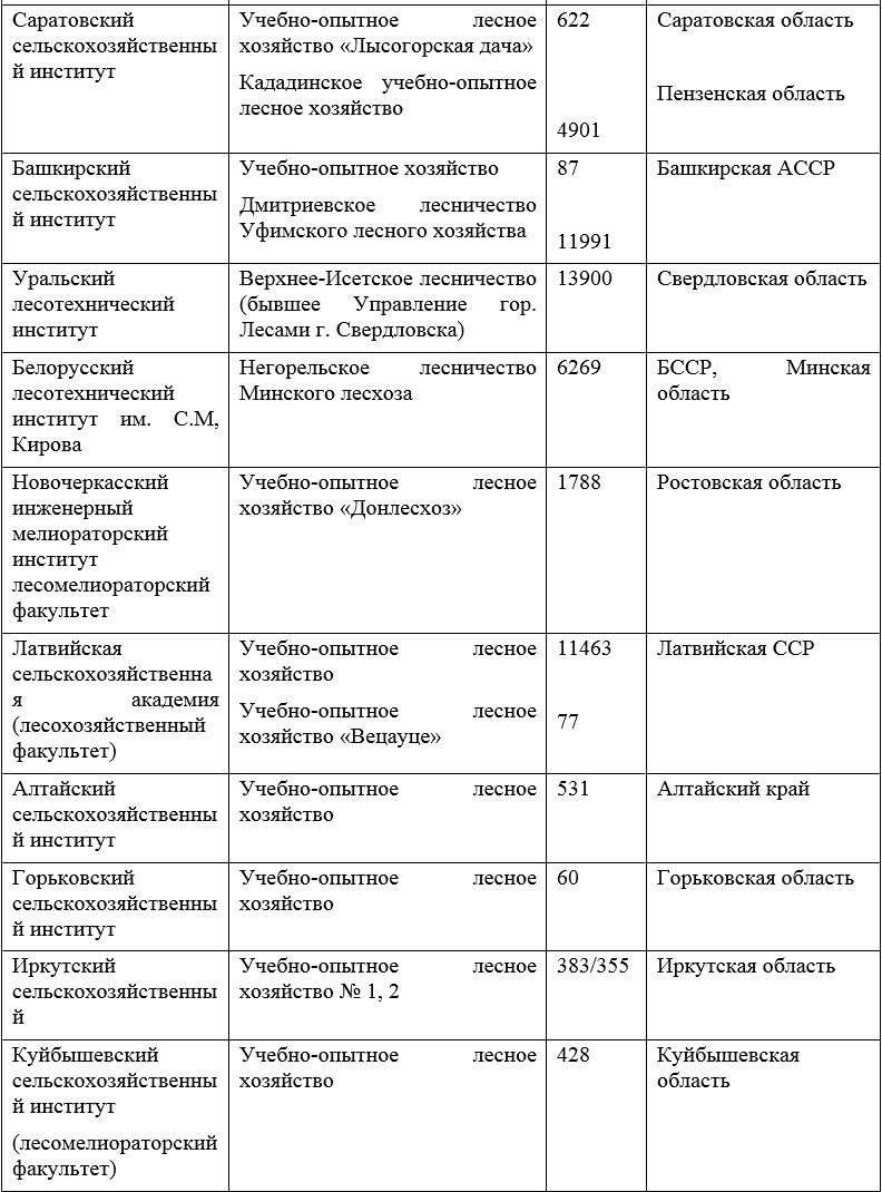 Список лесов учебно-опытных лесных хозяйств, закрепляемых за высшими учебными заведениями Министерства высшего образования СССР