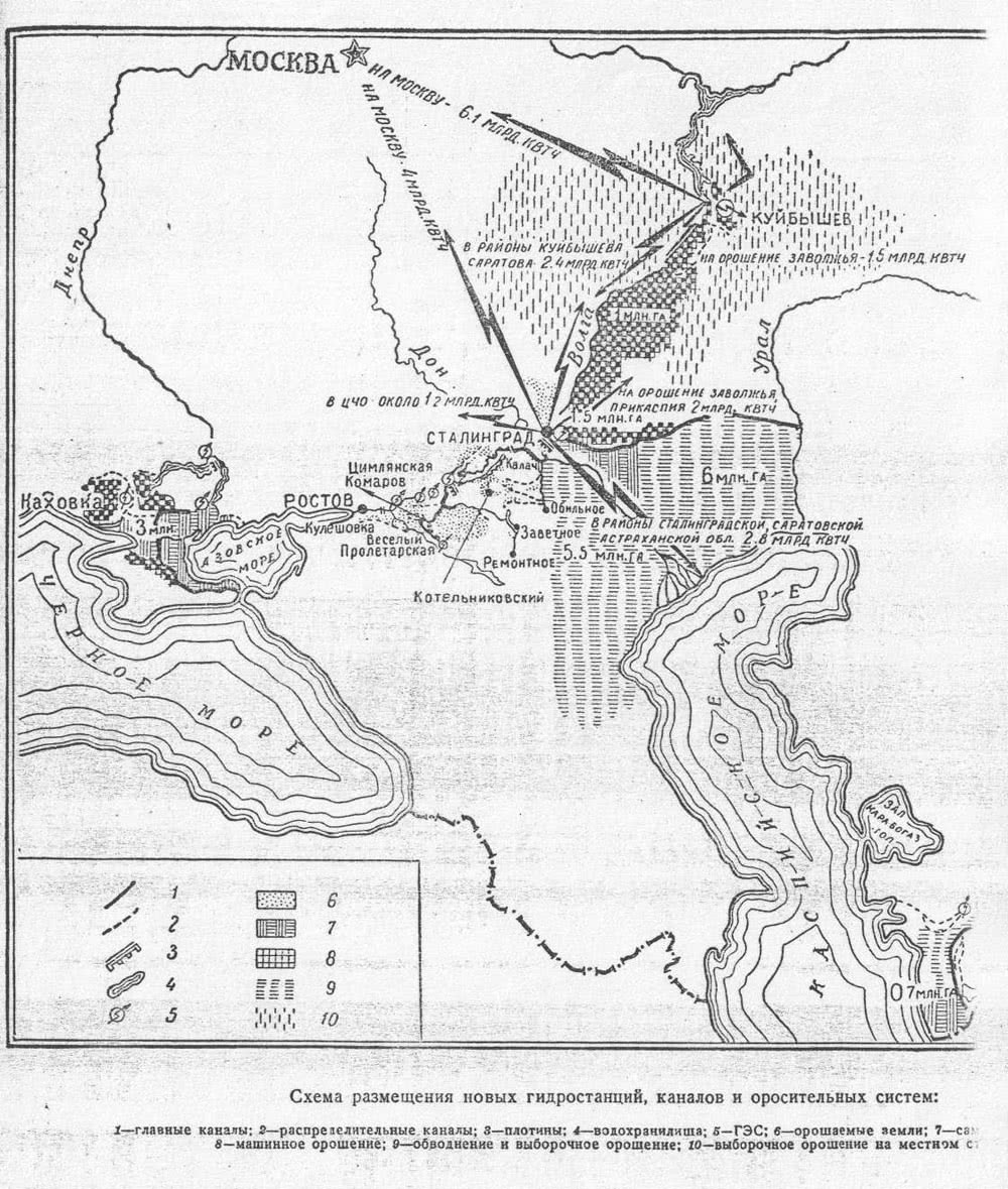 План народного хозяйства лежит в основе постановлений Совета Министров СССР о строительстве грандиозных гидросооружений и оросительных каналов, являющихся неразрывными, звеньями великого Сталинского плана преобразования природы.