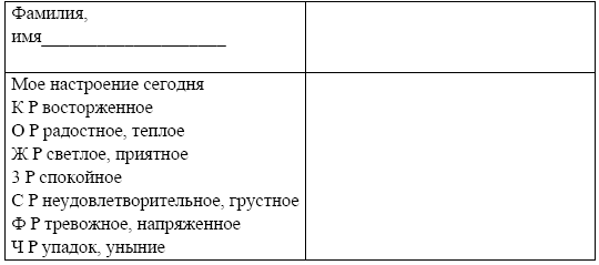 На плотном листе бумаги семь цветовых полос. Каждая цветовая полоса – условный знак настроения. В данном случае цветовые символы замечены буквенными обозначениями: К – красный, О – оранжевый, Ж – желтый, 3 – зеленый, С – синий, Ф – фиолетовый, Ч – черный. Цветовые полосы можно получить методом аппликации: наклеивать в дневник необходимые полоски цветной бумаги. Цветодневников нужно изготовить столько, сколько ребят примет участие в этой работе. Предположим, вы решили изучить настроение своих подростков в течение лагерной смены, для чего ежедневно в одни и те же часы