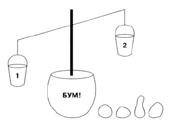 3. Бомба. Судья просит команду остановить за 5 минут взрыв бомбы, для этого надо уравновесить весы. В первом ведерке лежит камушек. Судья предлагает игрокам 3 камушка, из которых они должны выбрать и положить его во второе ведерко. Задача ребят: попытаться определить вес камушка в первом ведерке и найти ему противовес. Если команде это удается, то она проходит ловушку, если нет, то судья начисляет ей 5 штрафных очков.