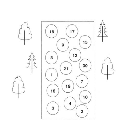 7. Алфавит. Перед командой нарисованы мелом 15 кружков с цифрами. Судья предлагает перевести слово «Браун» из алфавита в цифры (А – 1, Б – 2…). Задача команды пройти эту ловушку, наступая только на те кружки, где есть цифры из имени Браун (2, 18, 1, 21, 15). Штрафной балл получает участник, который сделает ошибку и встанет не на тот круг.