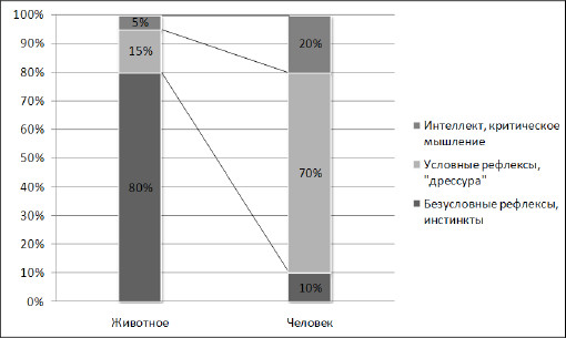 Что касается анализа поведения человека – первейшая роль приписывается его интеллекту, на действие этого регулятора поведения человека отдается 60–70%. Ну и оставшиеся 30–40% равномерно распределяют между «голосом тела», то есть инстинктивными побуждениями, и «последствиями воспитания», или обусловленными рефлексами.