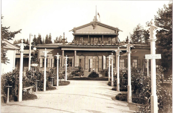 Кроме всем известной мельницы, на участке располагался благоустроенный парк, где находились красивые беседки, пышные цветники, игровые площадки и та самая благоустроенная двухэтажная дача, в которой мы сейчас живём. Были здесь баня, купальня, кегельбан, цветочные и плодовые оранжереи, зимний сад, пальмовые, ананасовые и огуречные теплицы.