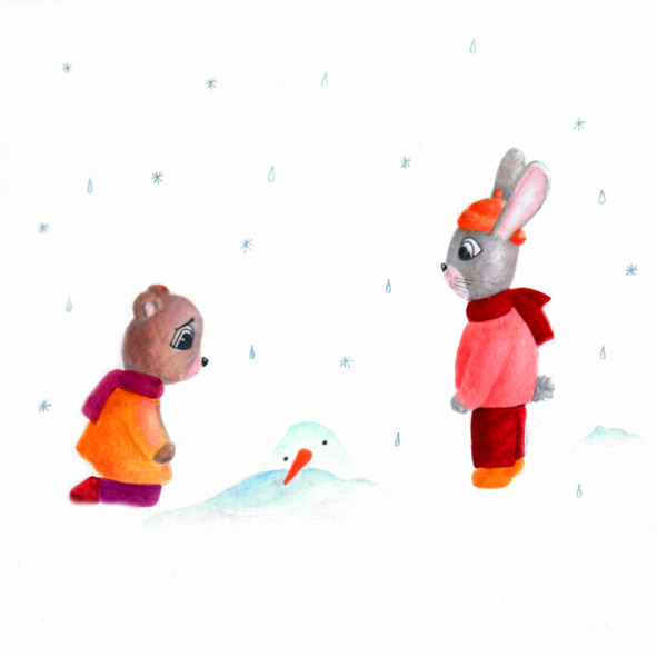 Первый, белый, лёгкий снег,Радостью осыпал всех,Кружится, летает,Жаль, что быстро тает.Лепим мы снеговика —Он не лепится пока,Что же за нелепица —Снеговик не лепится.Просим мы, чтоб облака,Снег насыпали слегка,Мы тогда, с друзьями сможем,Вылепить снеговика!