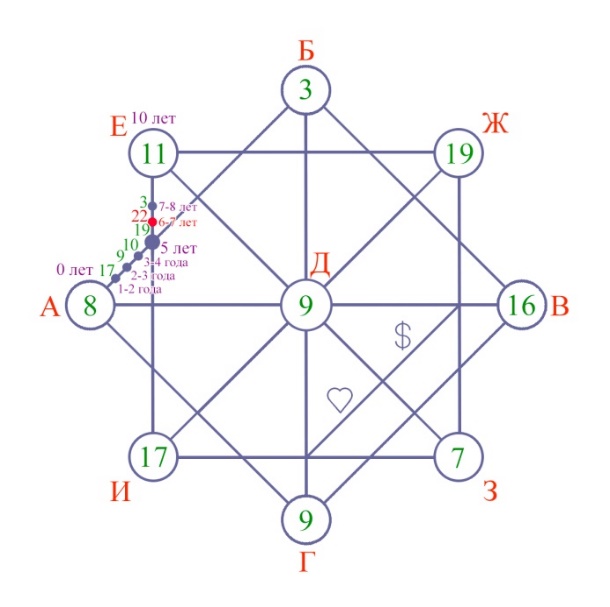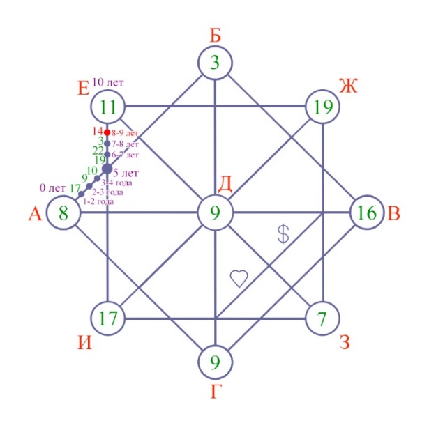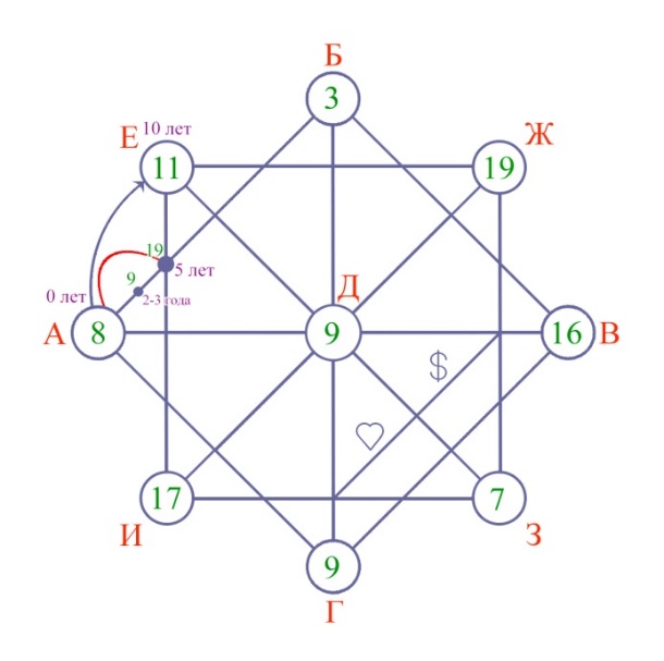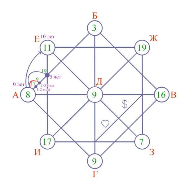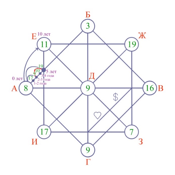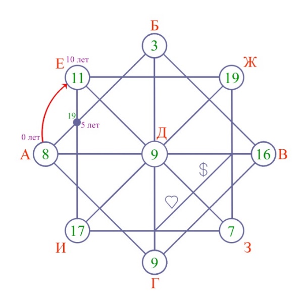 2. Ставим точку на пересечении прямого и прямоугольного квадрата на отрезке от точки (А) до (Е). Складываем между собой цифры, которые находятся в кружочках (А+Е) =8+11=19. В случае необходимости сводим до числа арканов. Таким образом, мы получили энергию, которая влияла на человека в 5 лет.