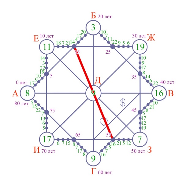 3. Затем находим троичный код Энергий года, который необходим нам для того, чтобы мы могли до бедующего дня рождения поработать над ней. От найденной точки нынешнего возраста клиента, проводим прямую линию на противоположную сторону, в моем случае линия была проведена от 55 годам к 15.