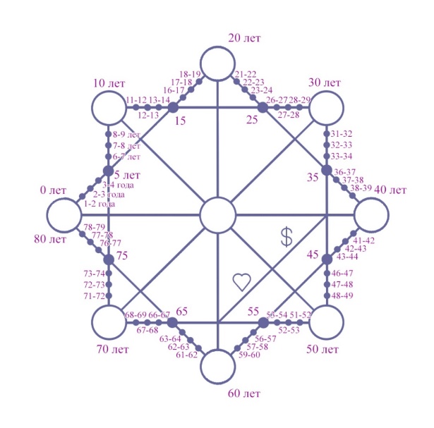 9. По такому же принципу просчитываем остальные отрезки в периметре матрицы. Принцип – сложение в середину отрезка. Отрезками являются промежутки от 0 до 10 лет, от 10 до 20 лет, от 20 до 30 лет и т. д. На 80 годах, мы снова возвращаемся к 0 лет.