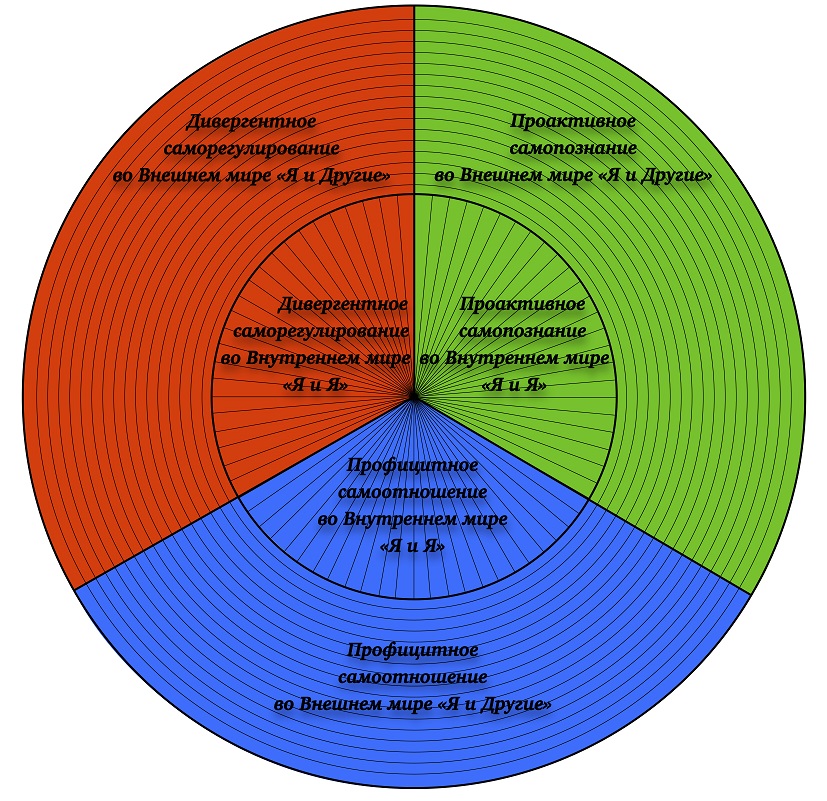 Обеспечивая, наглядность и понимание динамики саморазвития личности, объединим две составляющие: 1) структуру самосознания в саморазвитии, состоящую из проактивного самопознания, профицитного самоотношения и дивергентного саморегулирования; 2) Внутренний мир «Я и Я» и Внешний мир «Я и Другие», в которых живёт человек.