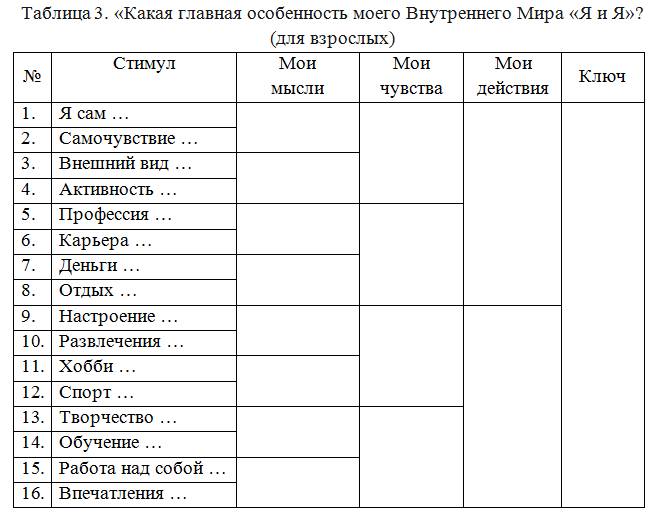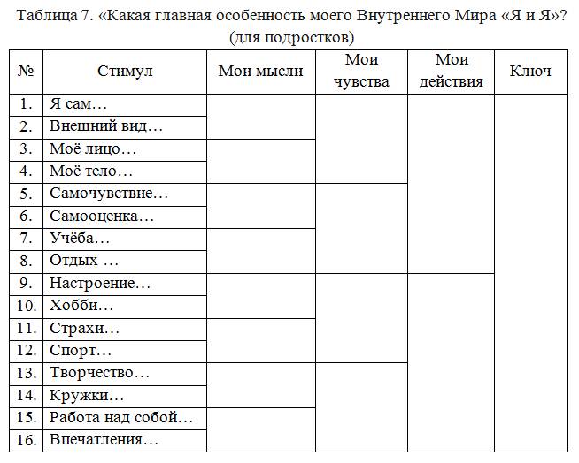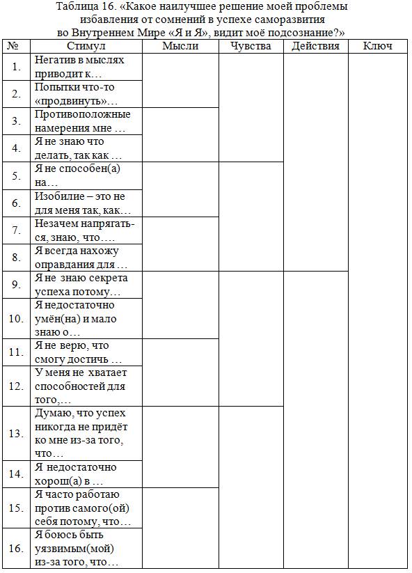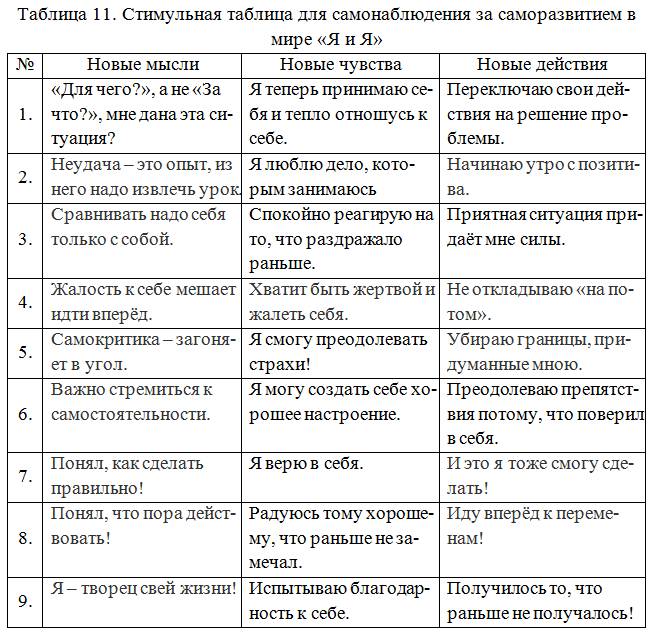Таблица 11. Стимульная таблица для самонаблюдения за саморазвитием во Внутреннем мире «Я и Я».