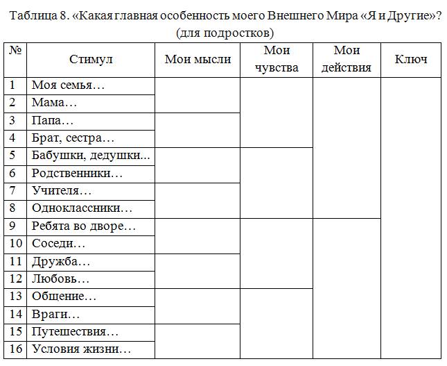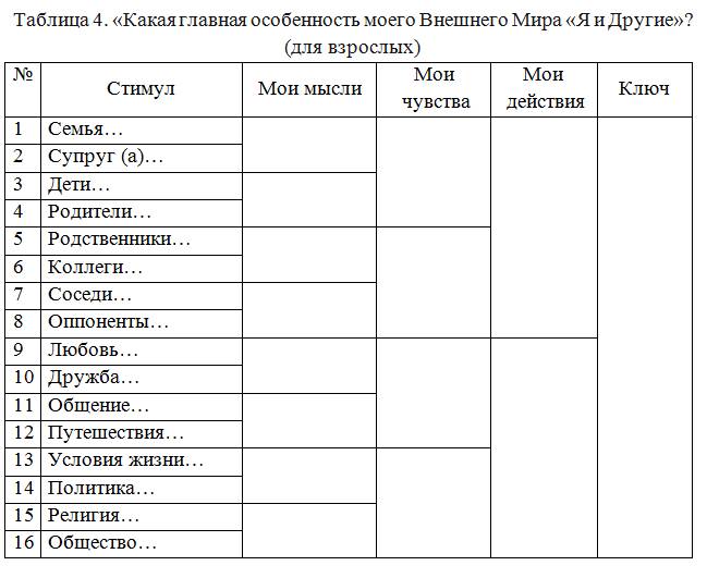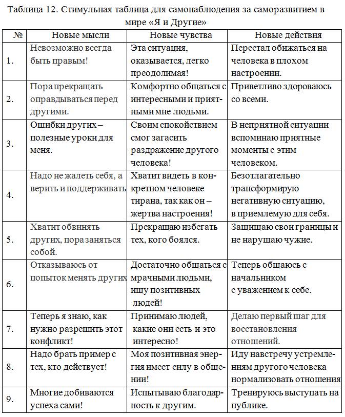 Таблица 12. Стимульная таблица для самонаблюдения за саморазвитием во Внешнем мире «Я и Другие».